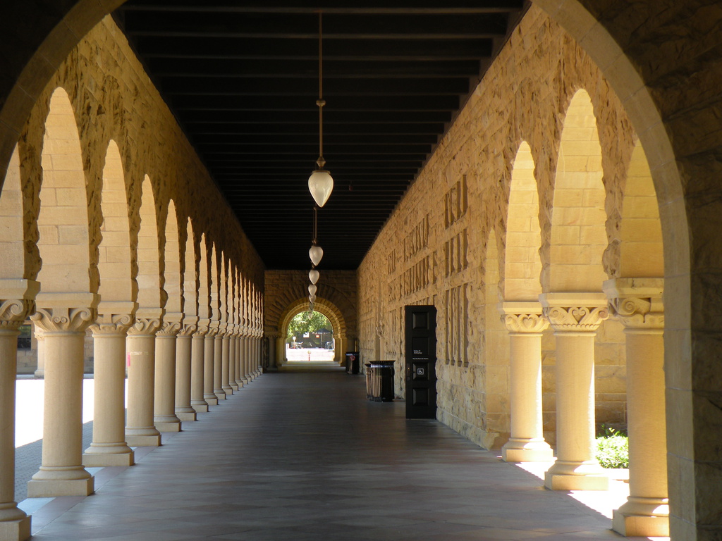 Description: A hallway with columns and a clock hanging from the ceiling and a light fixture hanging from the ceiling above.