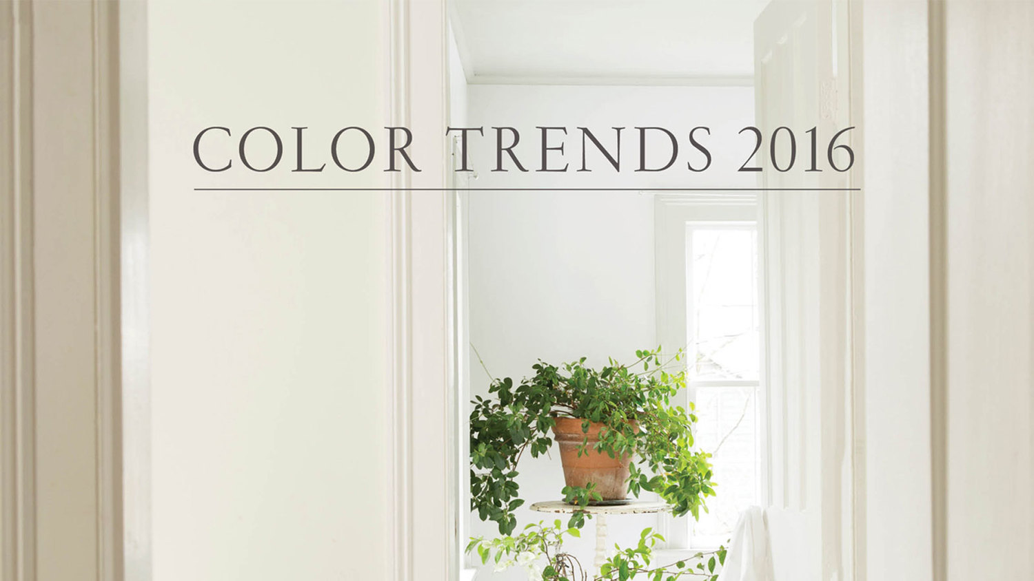 Description: A hallway with a potted plant and a window with the words color trend 2016 on it in black and white.