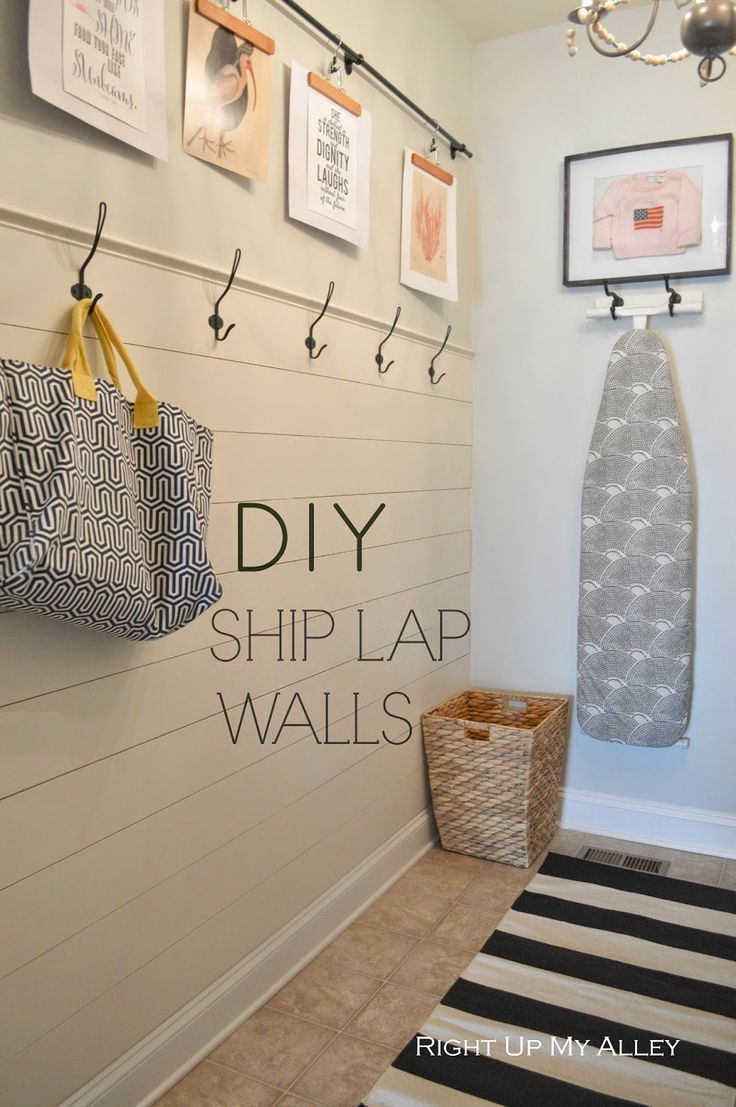 Description: A hallway with a surfboard and a coat rack on the wall and a laundry bag hanging on the wall.