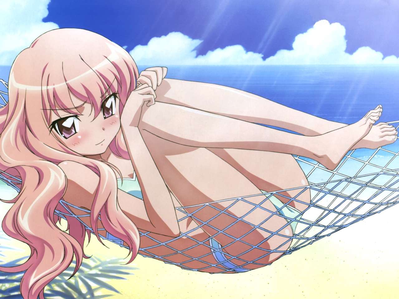 Description: A woman laying in a hammock on the beach with a pink hair and blue eyes and a pink nose.