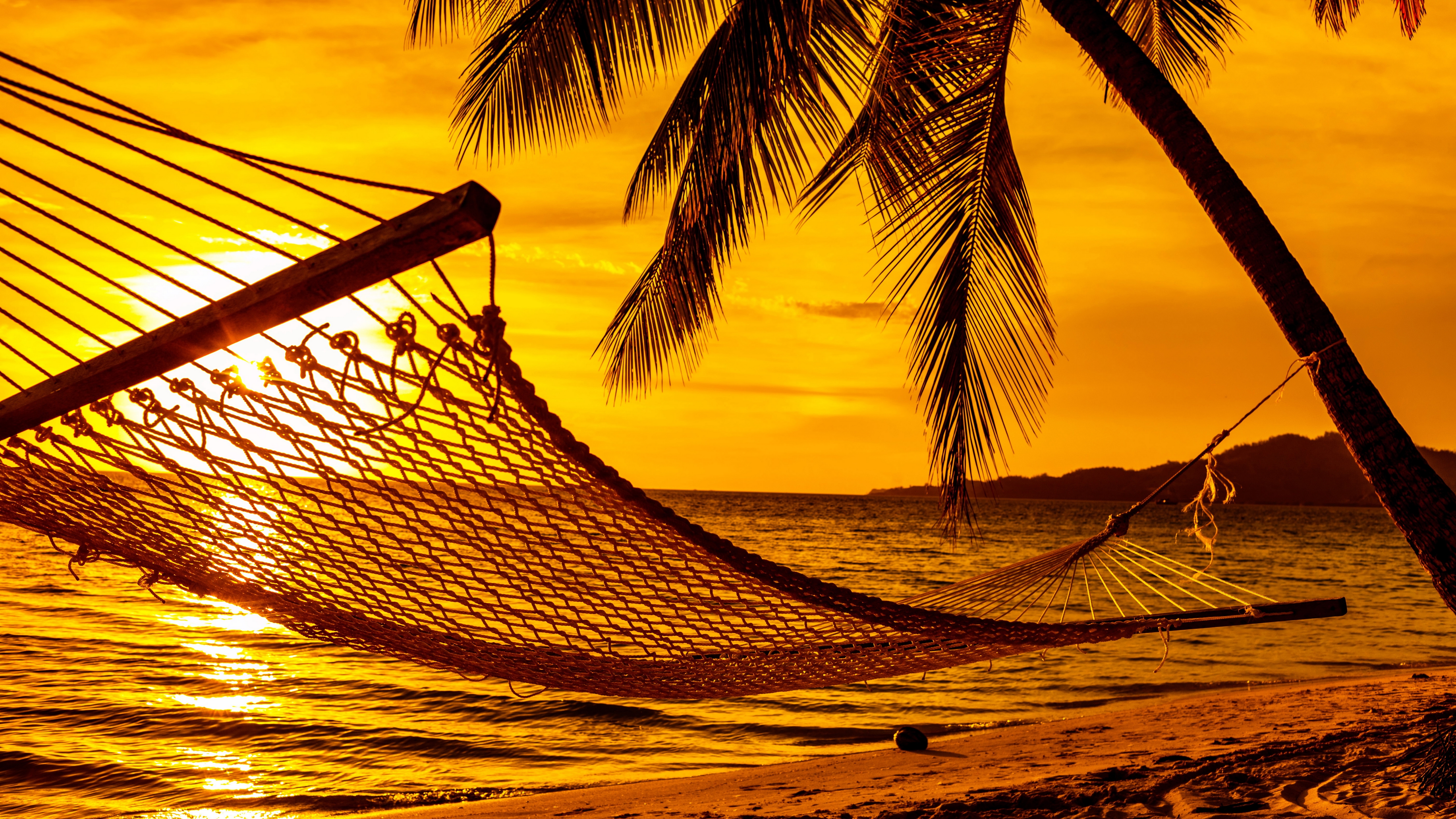 Description: A hammock hanging from a palm tree on a beach at sunset with the sun setting in the background.
