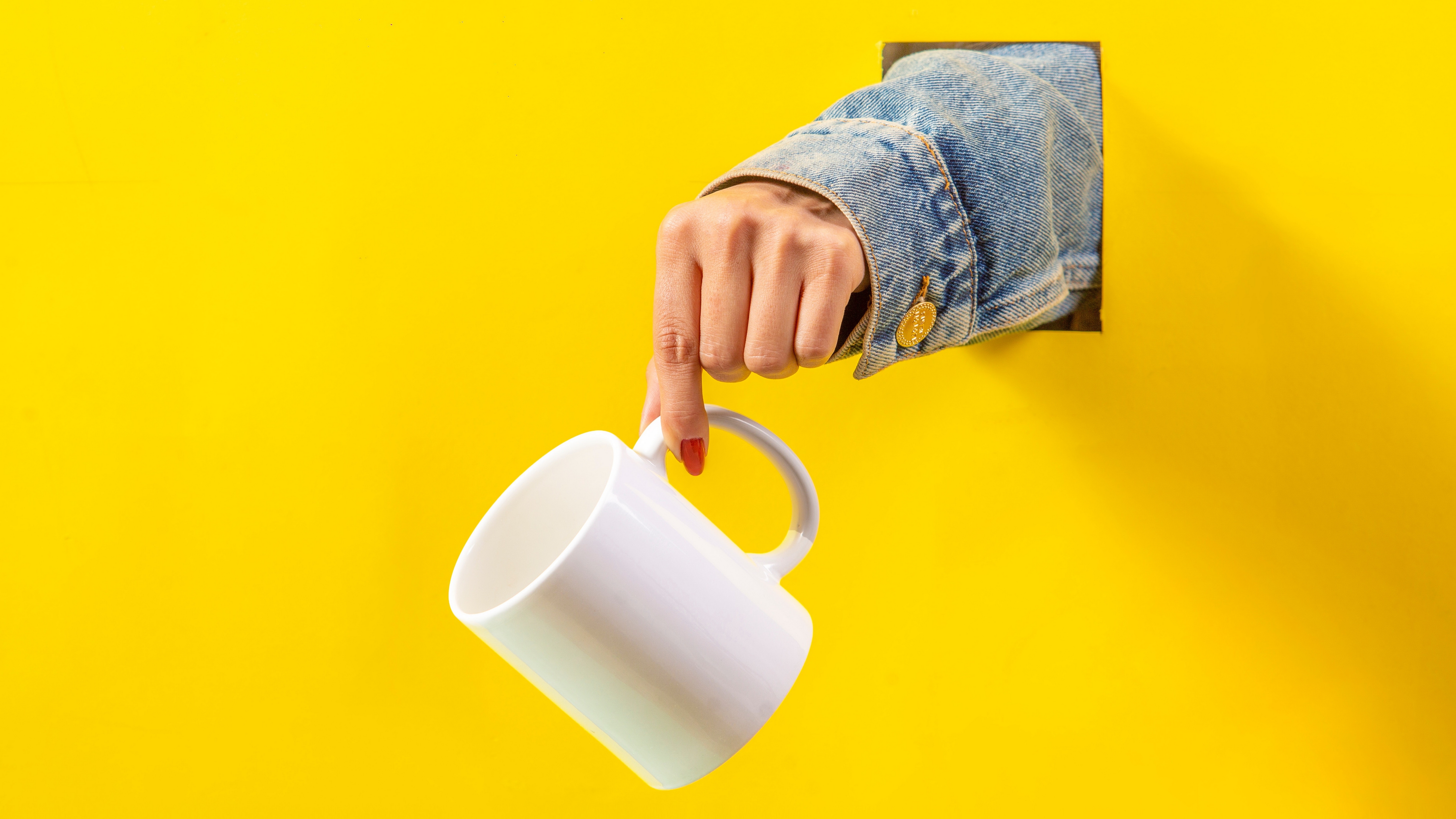 Description: A person's hand holding a coffee cup on a yellow background with a ring on the handle of the cup.