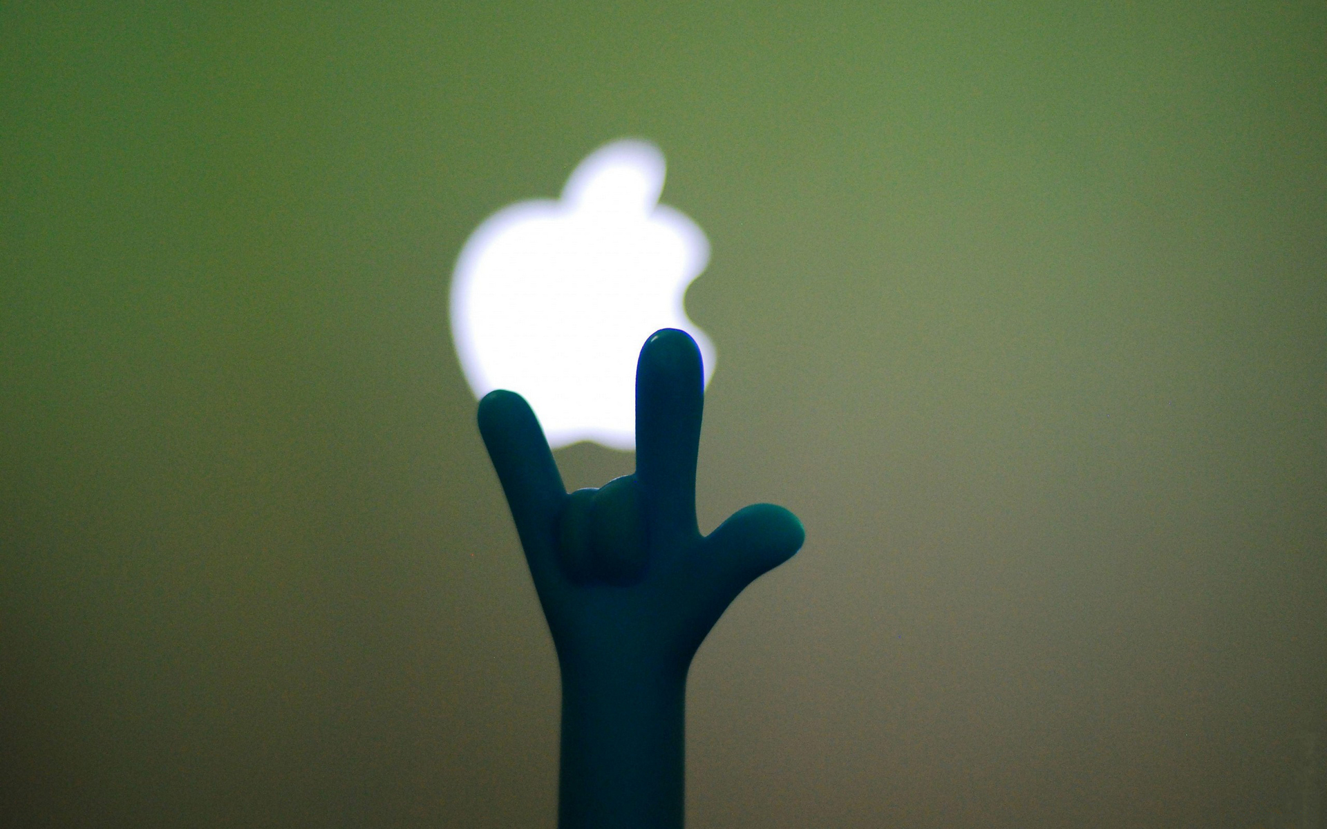 Description: A hand is holding an apple logo in front of a green background with a shadow of an apple on it.