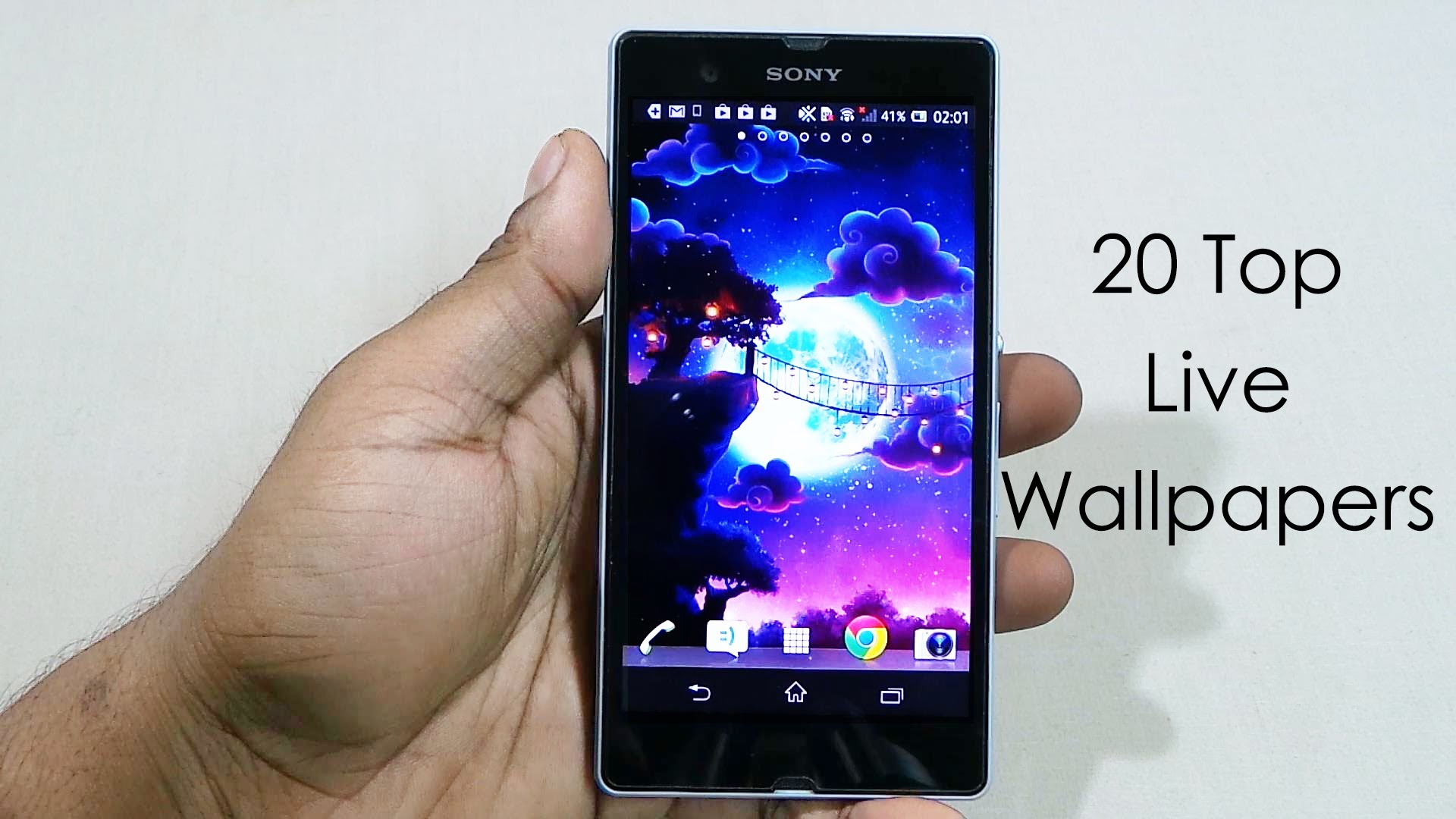 Description: A hand holding a cell phone with the text 20 top live wallpapers on it's screen.