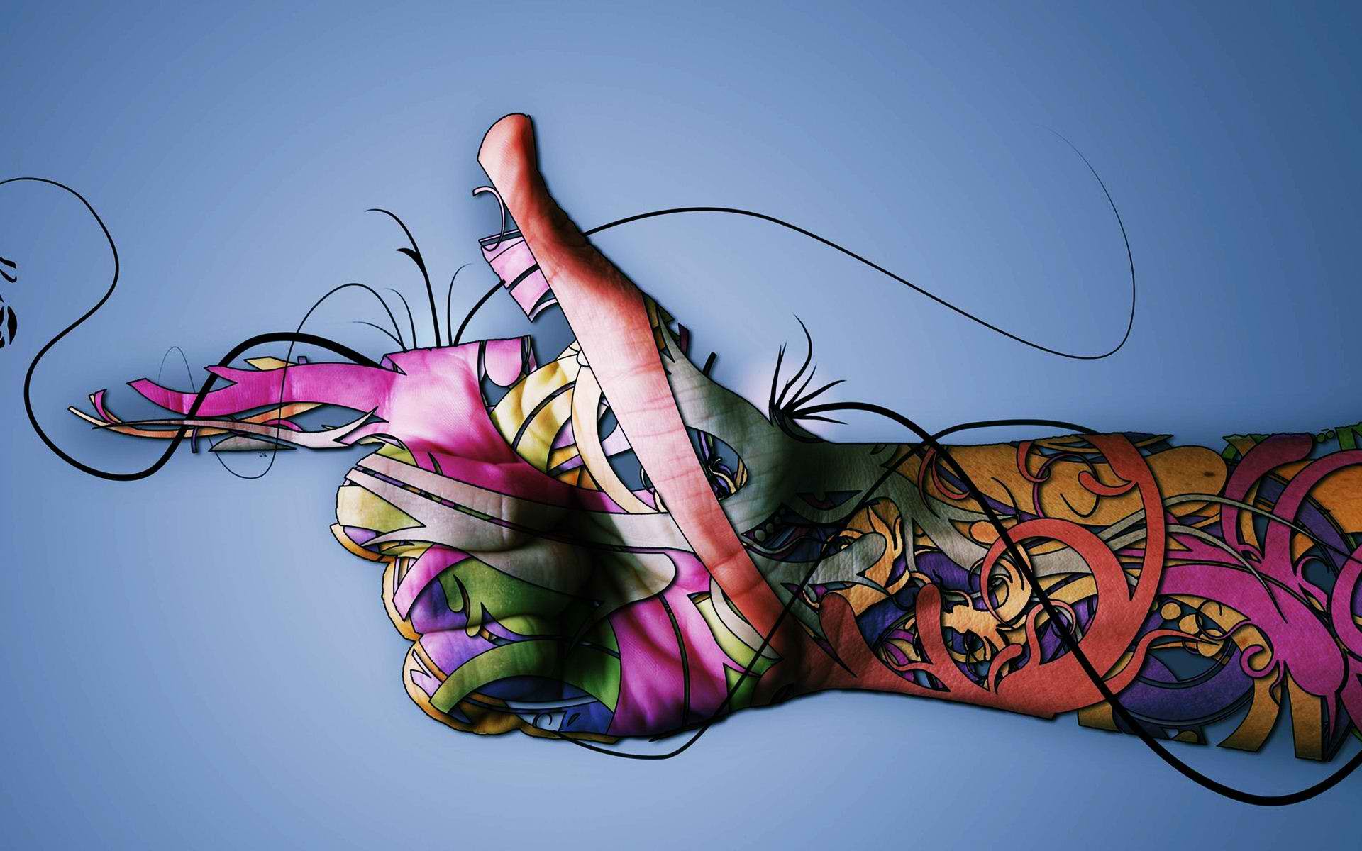 Description: A person's hand with a painted arm and a tattoo on it's arm and a blue background.