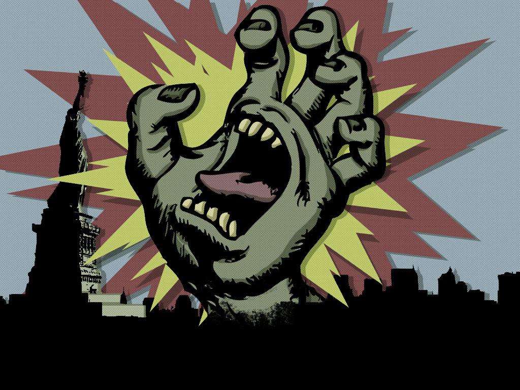 Description: A hand with a screaming face and a city in the background with a building in the foreground and a building in the background.