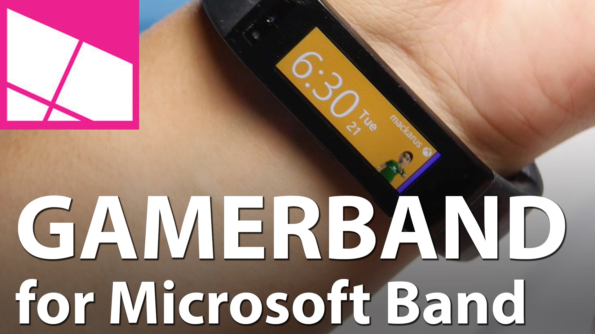 Description: A hand holding a smart watch with a gameband on it's wrist and the text gameband for microsoft band.