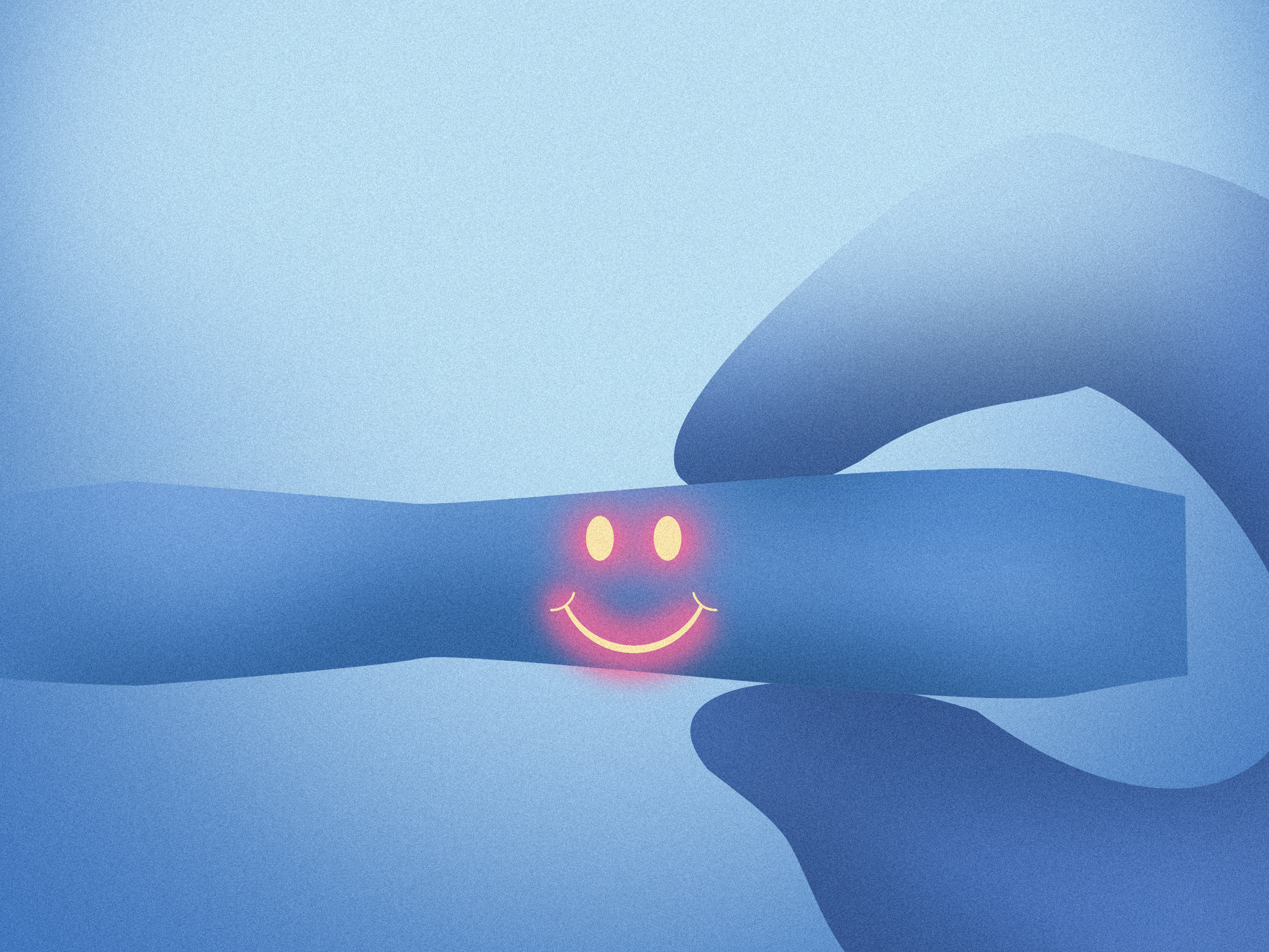Description: A hand holding a smiley face on it's wrist with a blue background and a red light coming from the middle of the wrist.