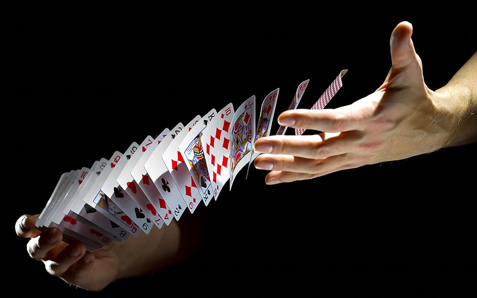 Description: A hand holding a stack of playing cards with a black background behind it and a hand reaching for it.