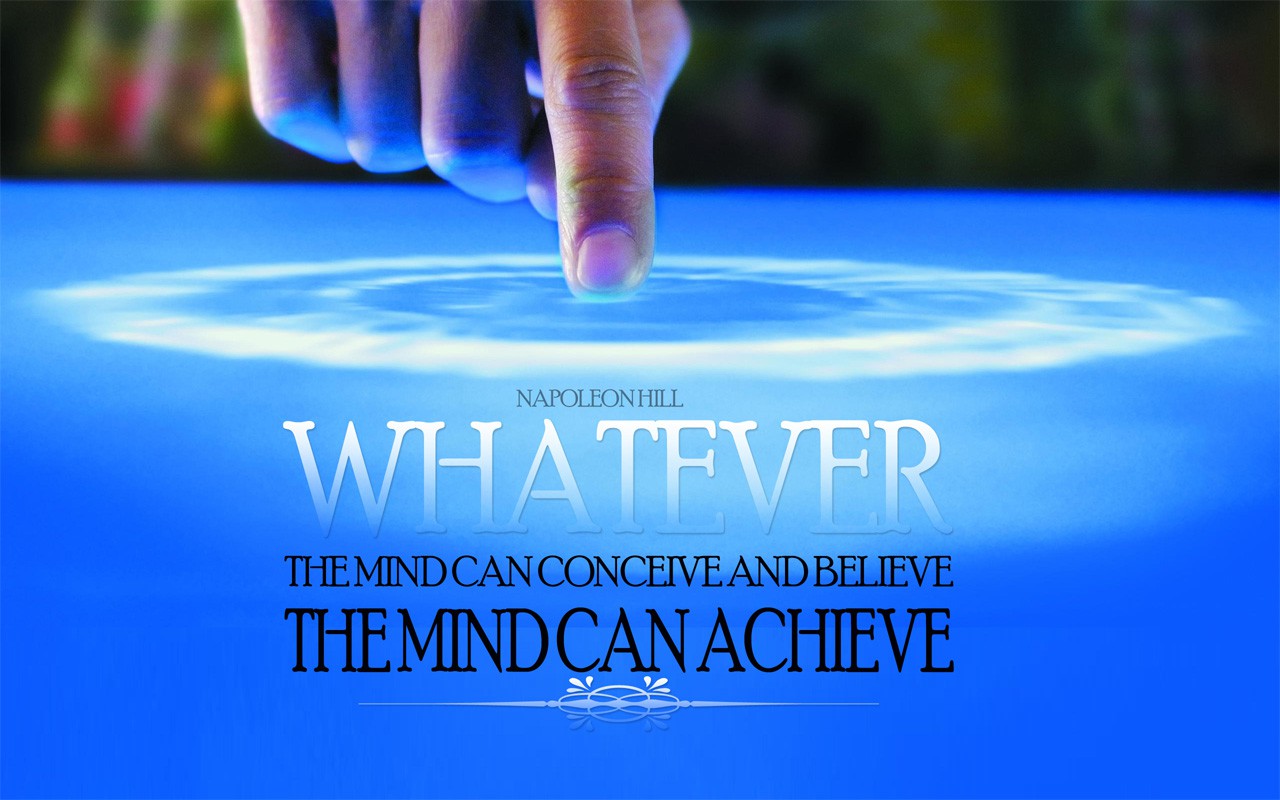 Description: A hand touching a blue surface with the words whatever on it and a blue background with a white circle.