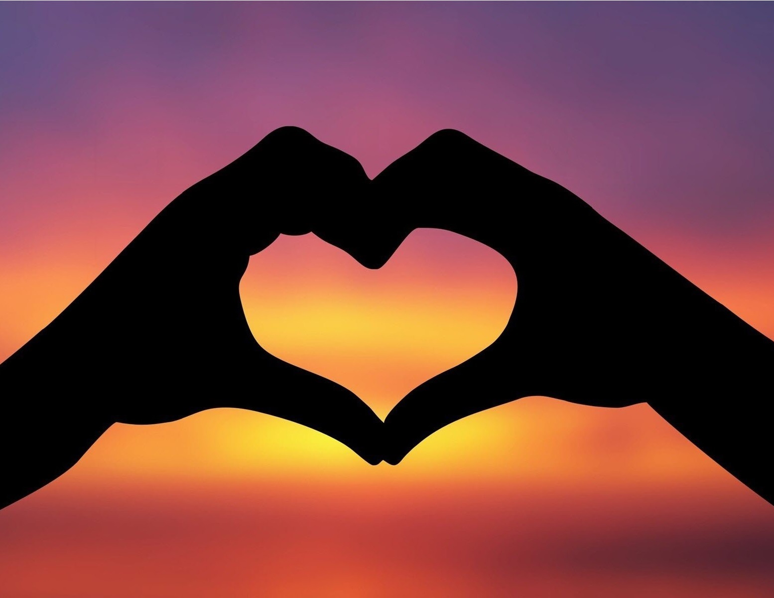 Description: A couple of hands making a heart shape with a sunset in the background and a pink and purple sky.