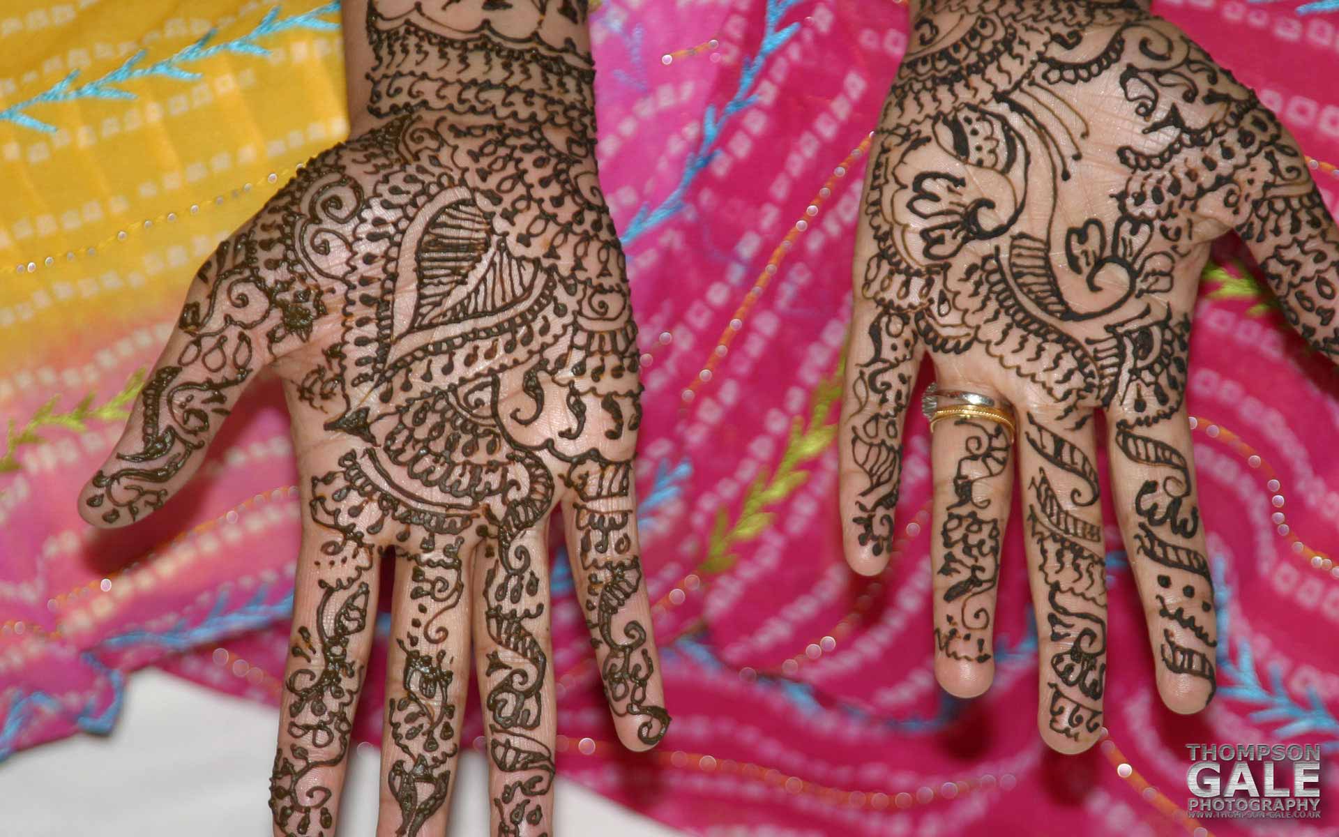 Description: A close up of two hands with hendi tattoos on them and a colorful cloth behind them with a pattern.