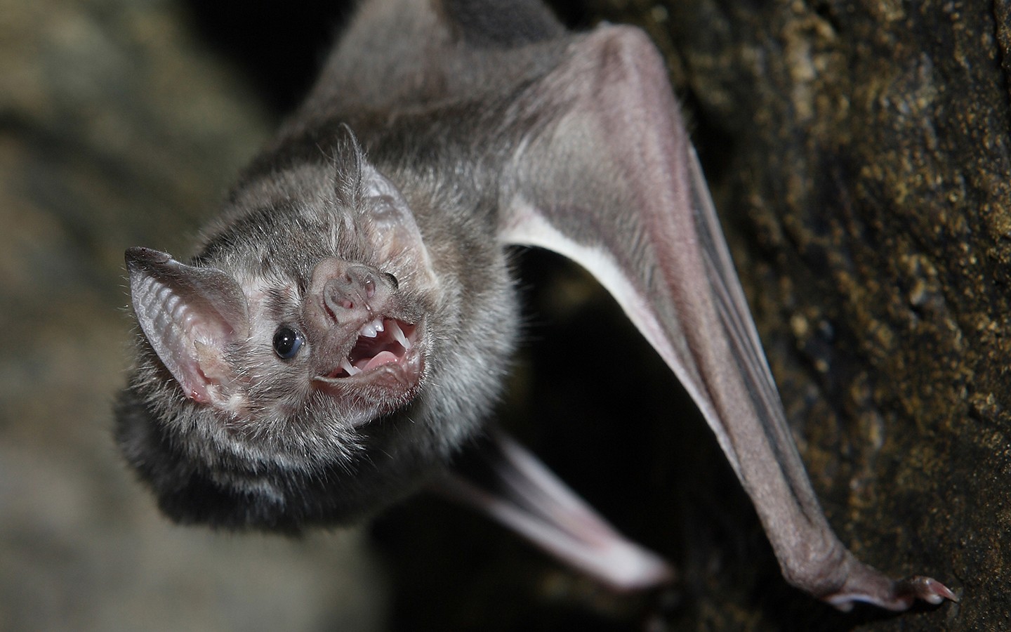 Description: A bat is hanging upside down on a tree branch with its mouth open and it's tongue out.