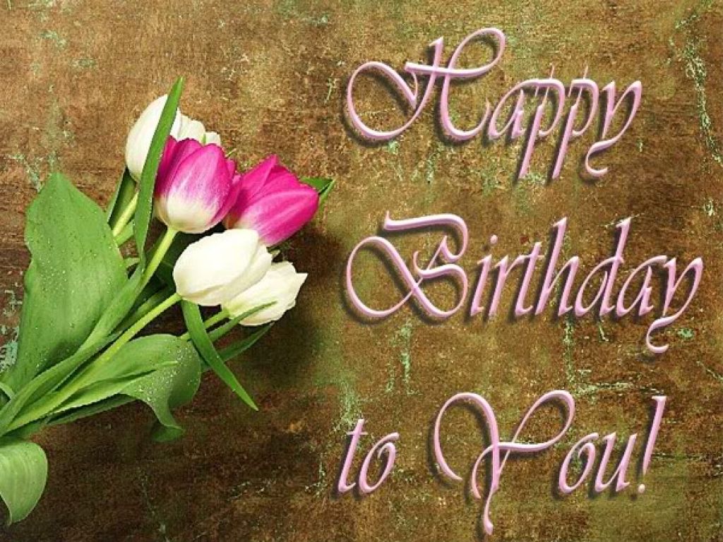 Description: A happy birthday to you card with flowers on a table with a brown background and a message that reads.