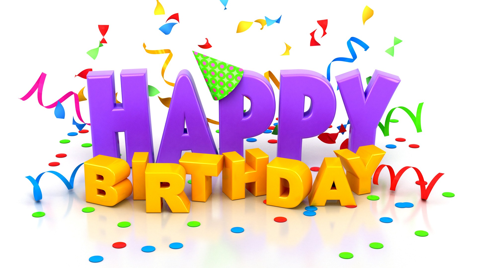 Description: A happy birthday message with confetti and streamers on a white background with a party hat on top.