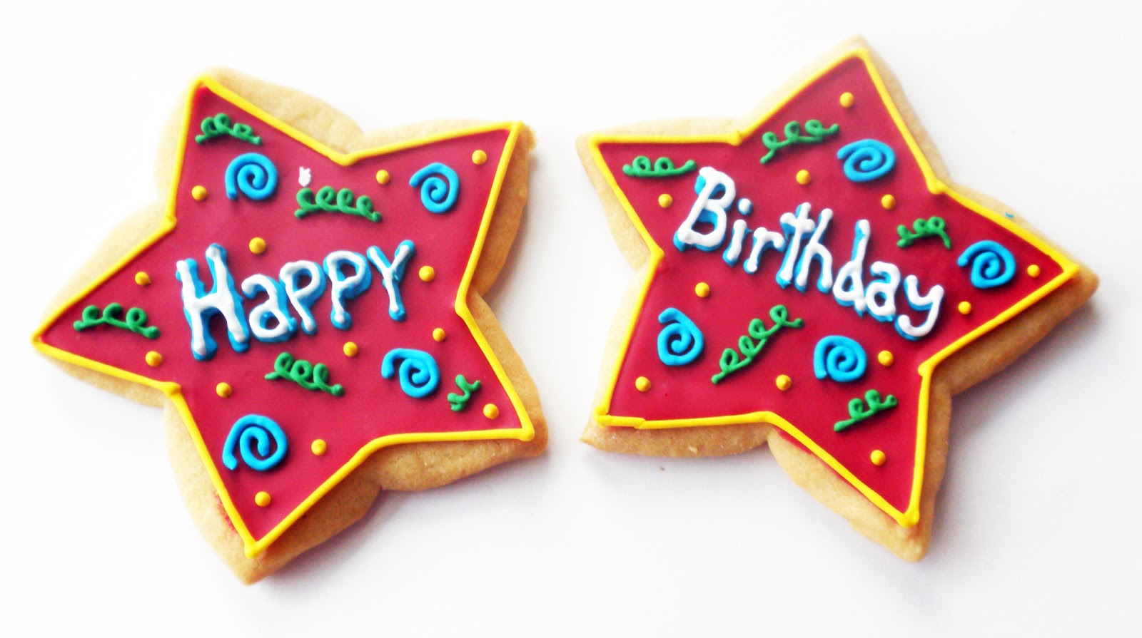 Description: Two decorated cookies with happy birthday written on them.