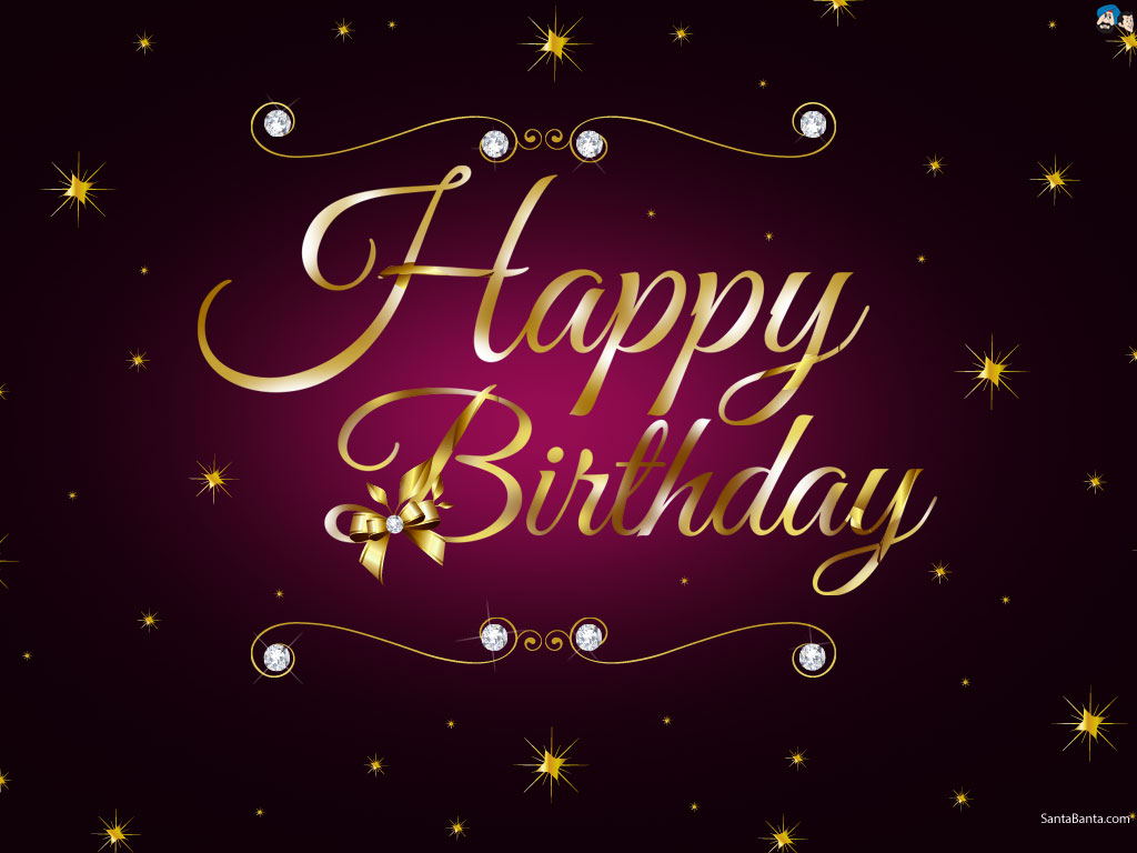 Description: A happy birthday card with gold lettering on a purple background with stars and sparkles in the background and a purple background with gold stars.