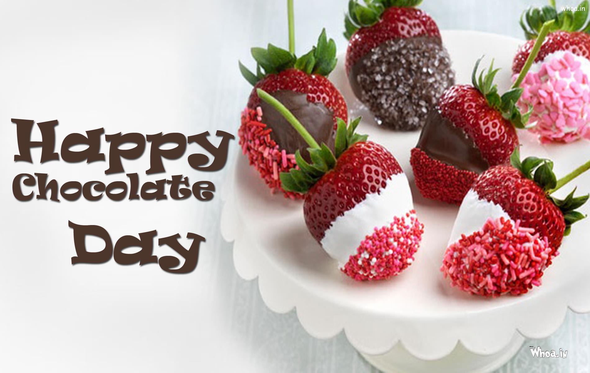 Description: A white plate topped with strawberries and chocolate covered strawberries with the words happy chocolate day written on it.