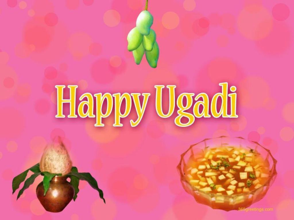 Description: A colorful picture of a happy ugadi with a fruit and vegetable decoration on it's side.