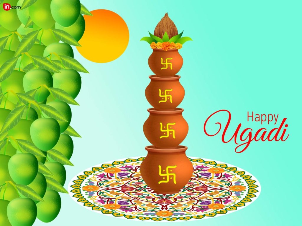 Description: A happy vagadi with a vase of flowers on a tablecloth with a green background and a bamboo tree.