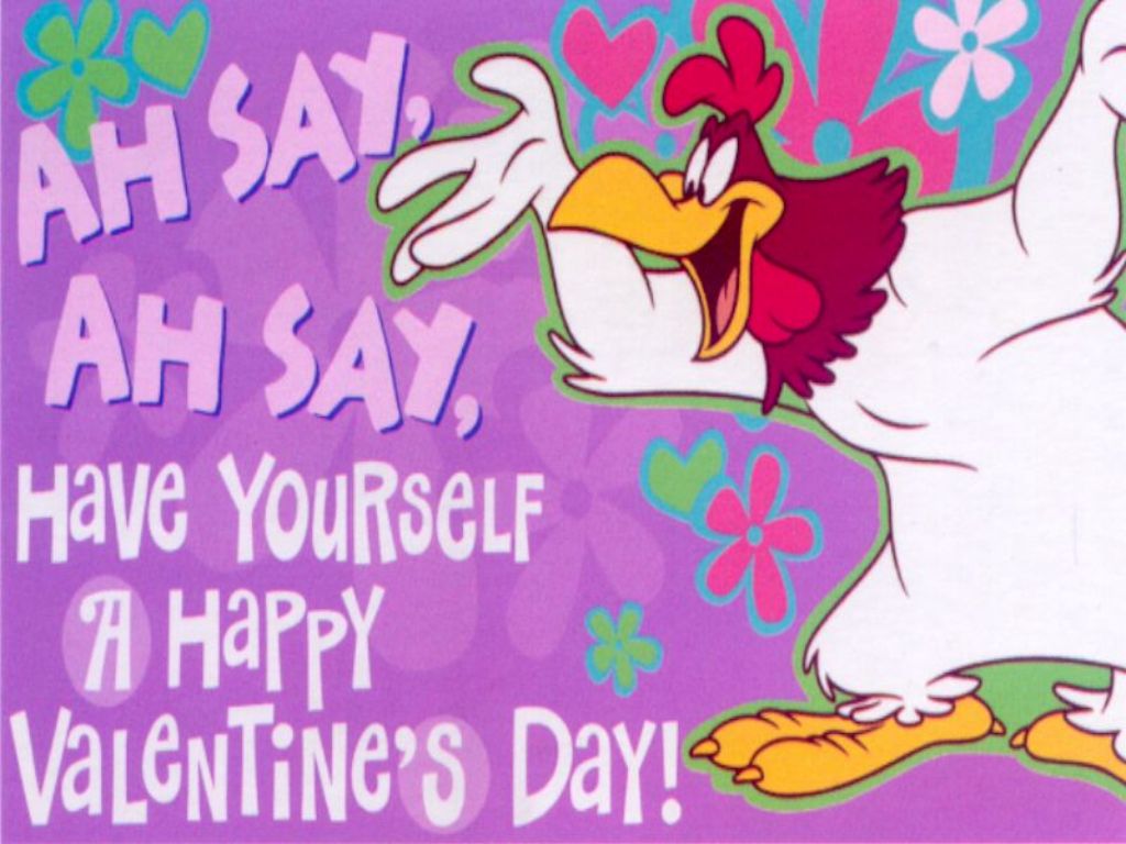 Description: A happy valentine's day card with a cartoon chicken holding a heart and a flower in its beak.