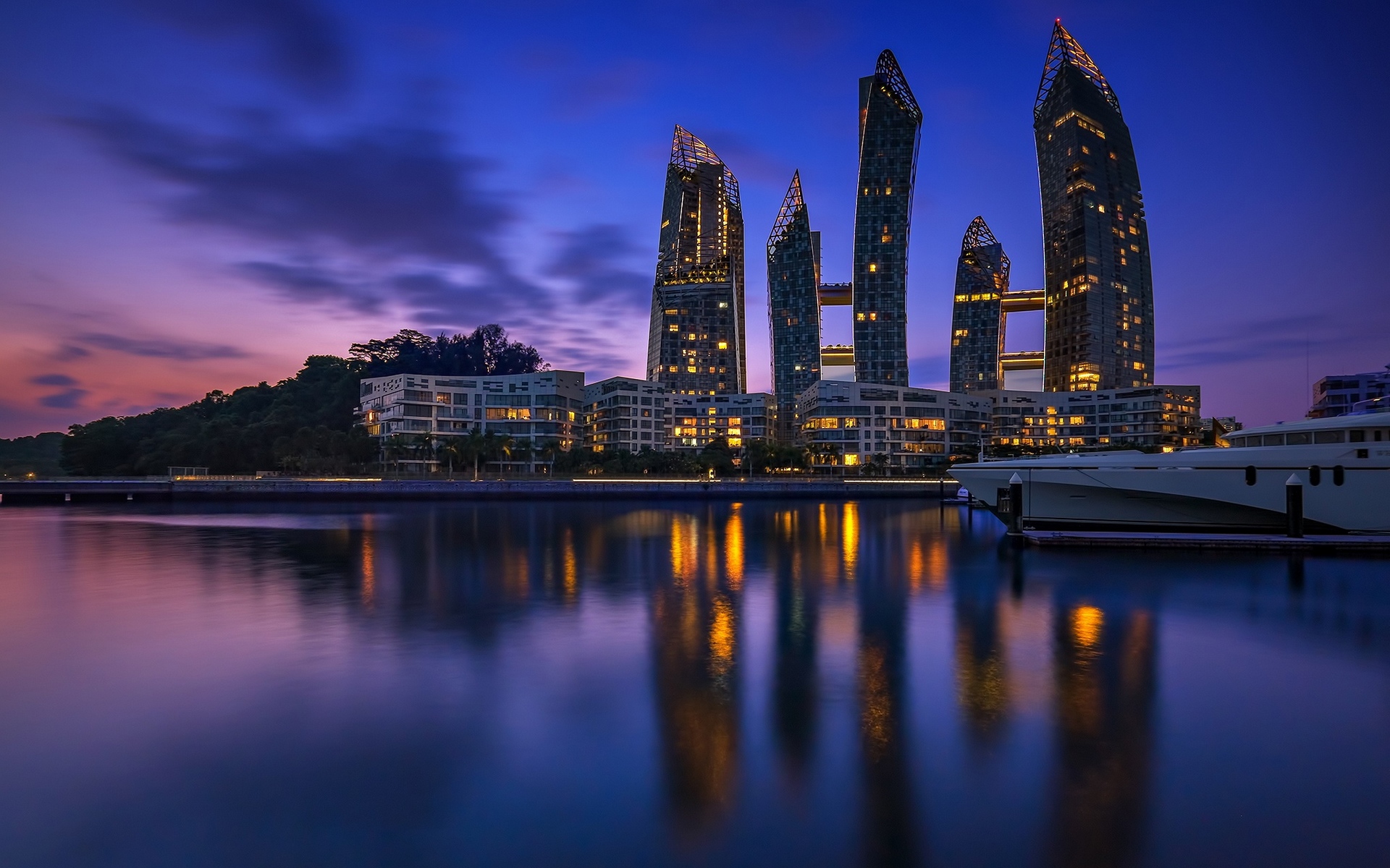 Description: A boat is docked in a harbor with a city in the background at night time with a purple sky.