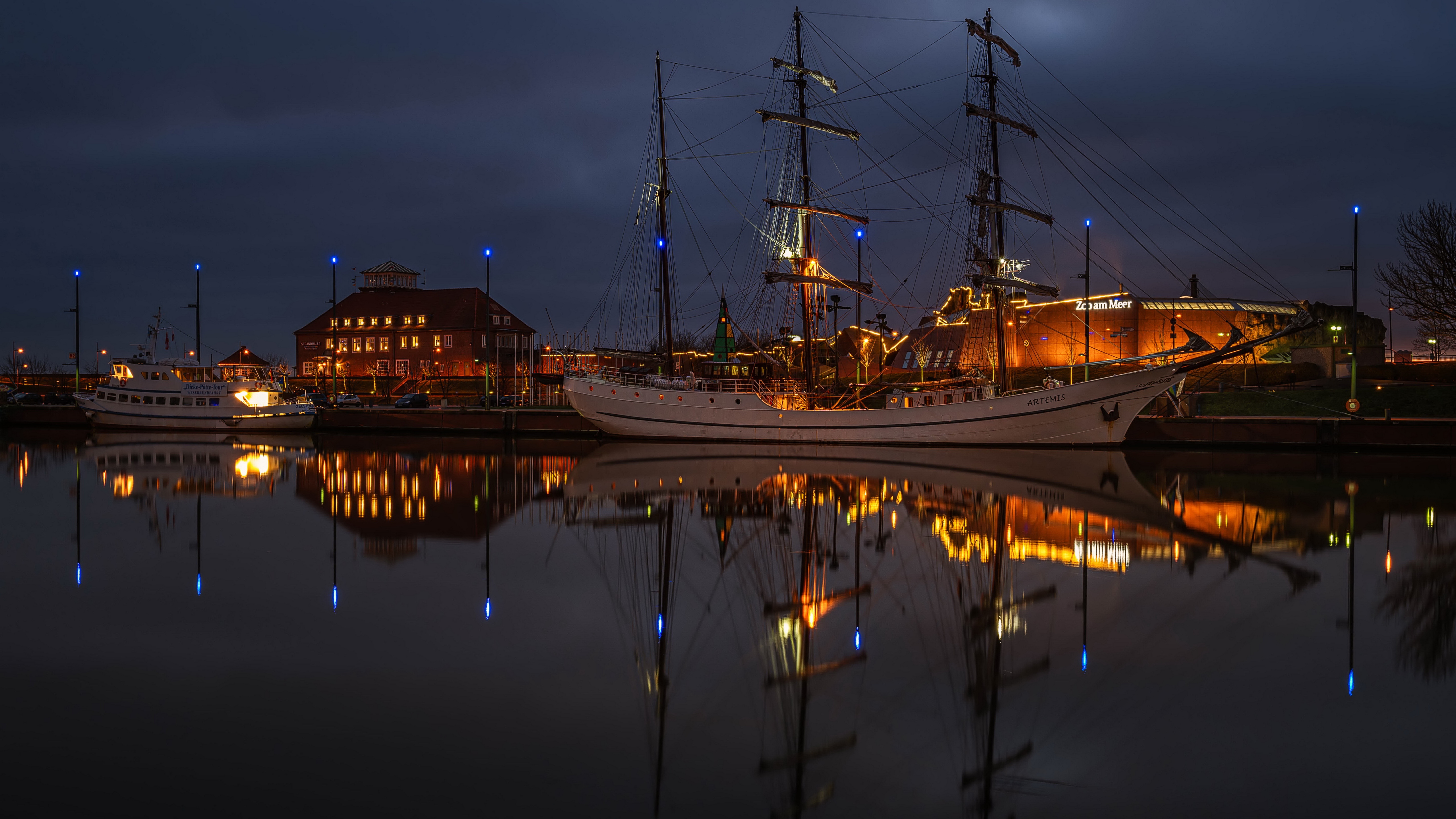 Description: A boat is docked in a harbor at night time with a full moon in the sky above it and a building in the background.