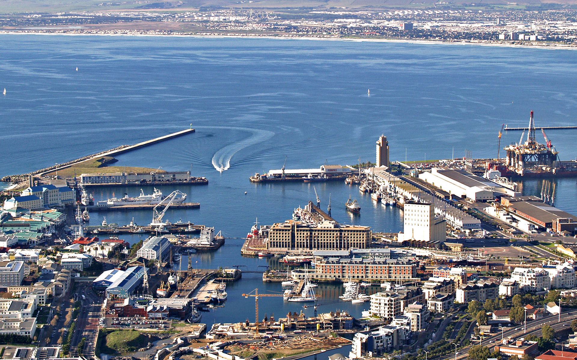 Description: A harbor with a lot of boats and buildings in it and a city in the background with a large body of water.