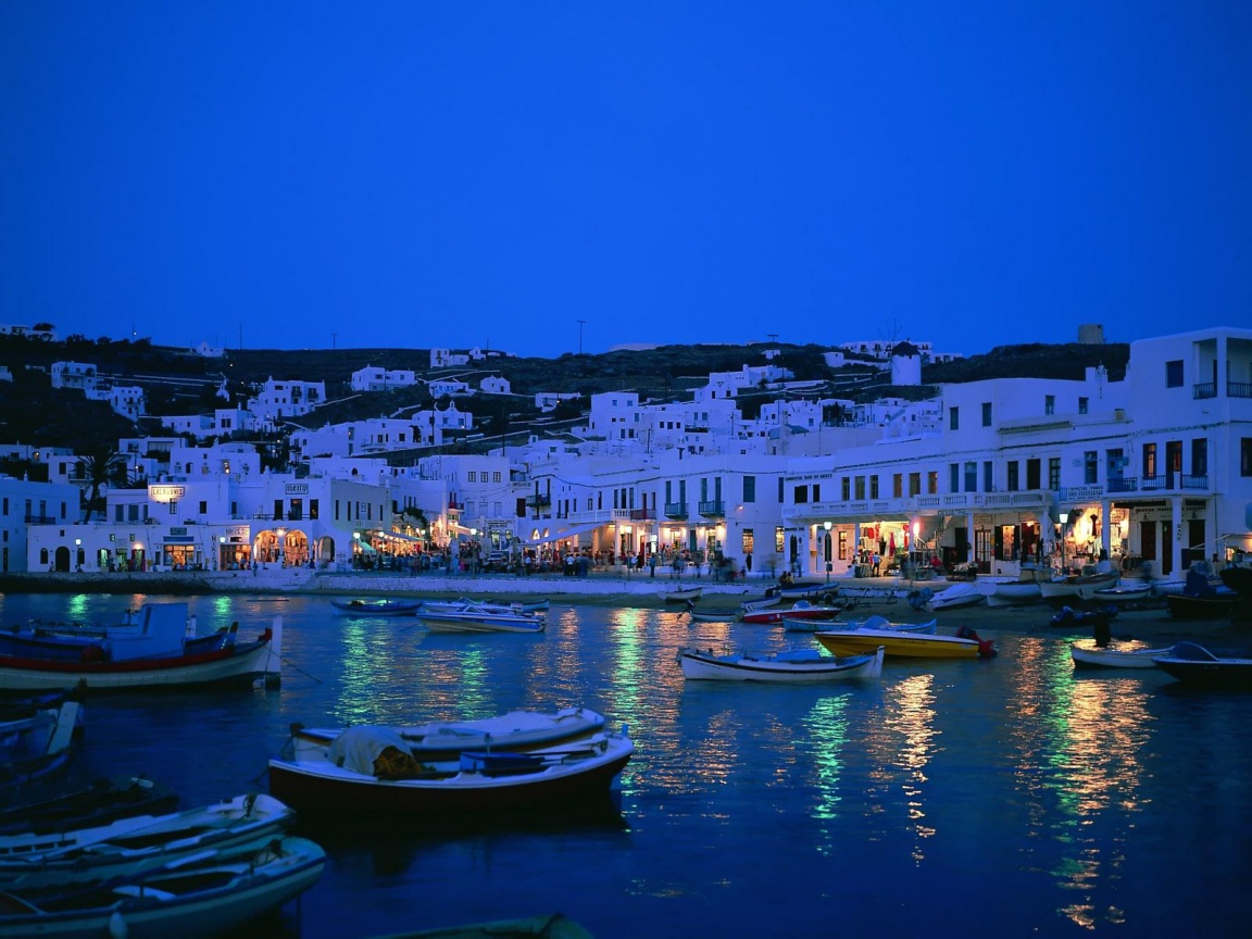 Description: A harbor filled with lots of boats next to a city at night time with lights on buildings and a hill in the background.