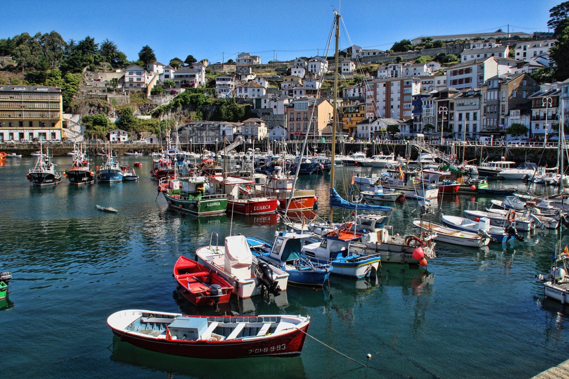 Description: A harbor filled with lots of boats next to a hillside covered with buildings and trees on a sunny day.