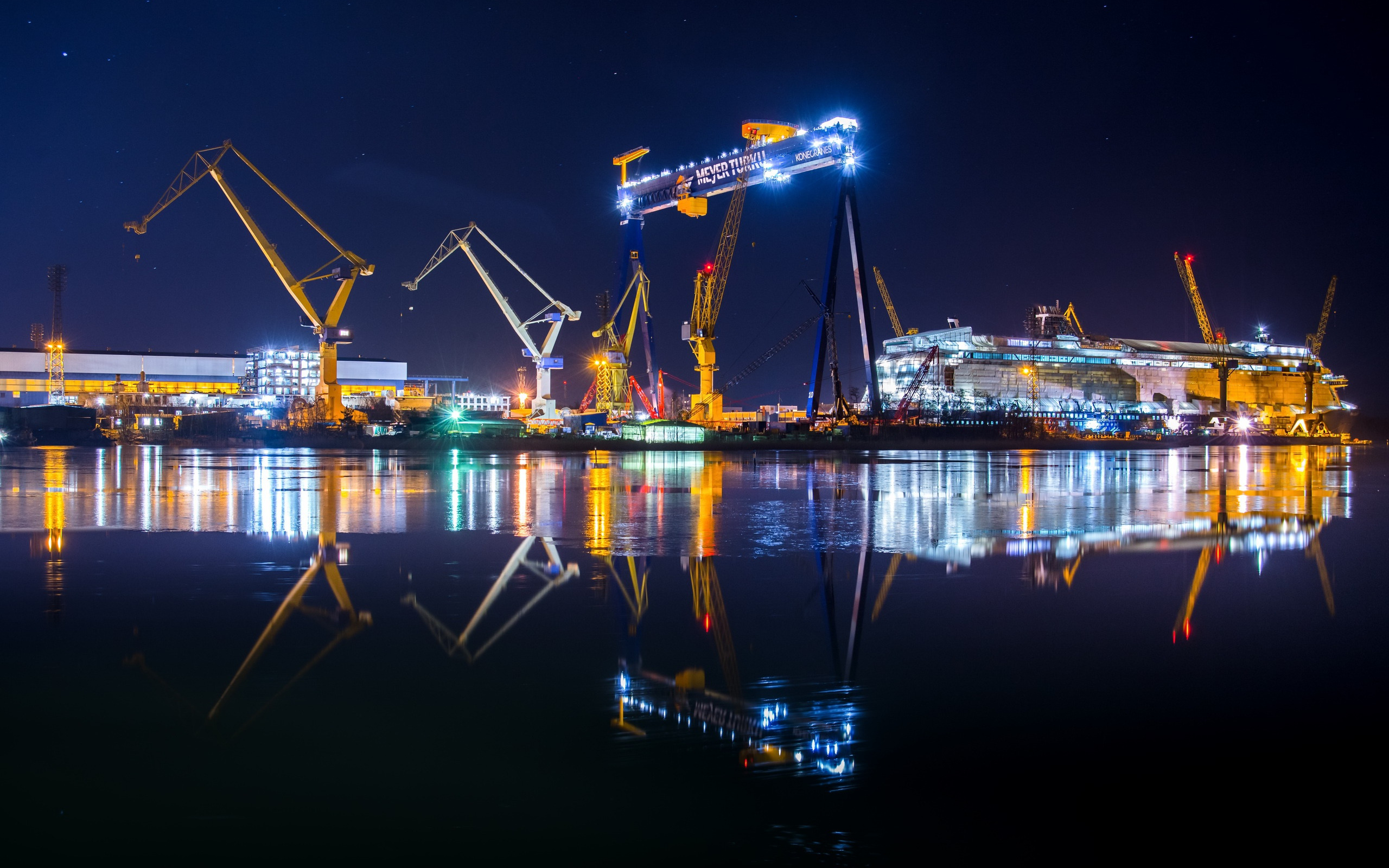 Description: A harbor filled with lots of cranes at night time with lights on them and a building in the background.