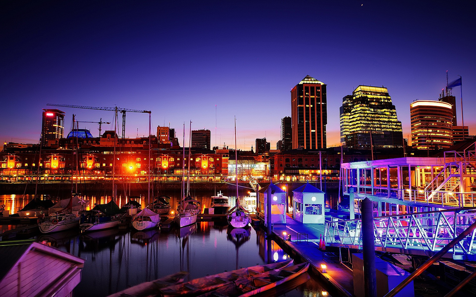 Description: A harbor with boats docked at night in a city with tall buildings in the background and a lit up bridge.