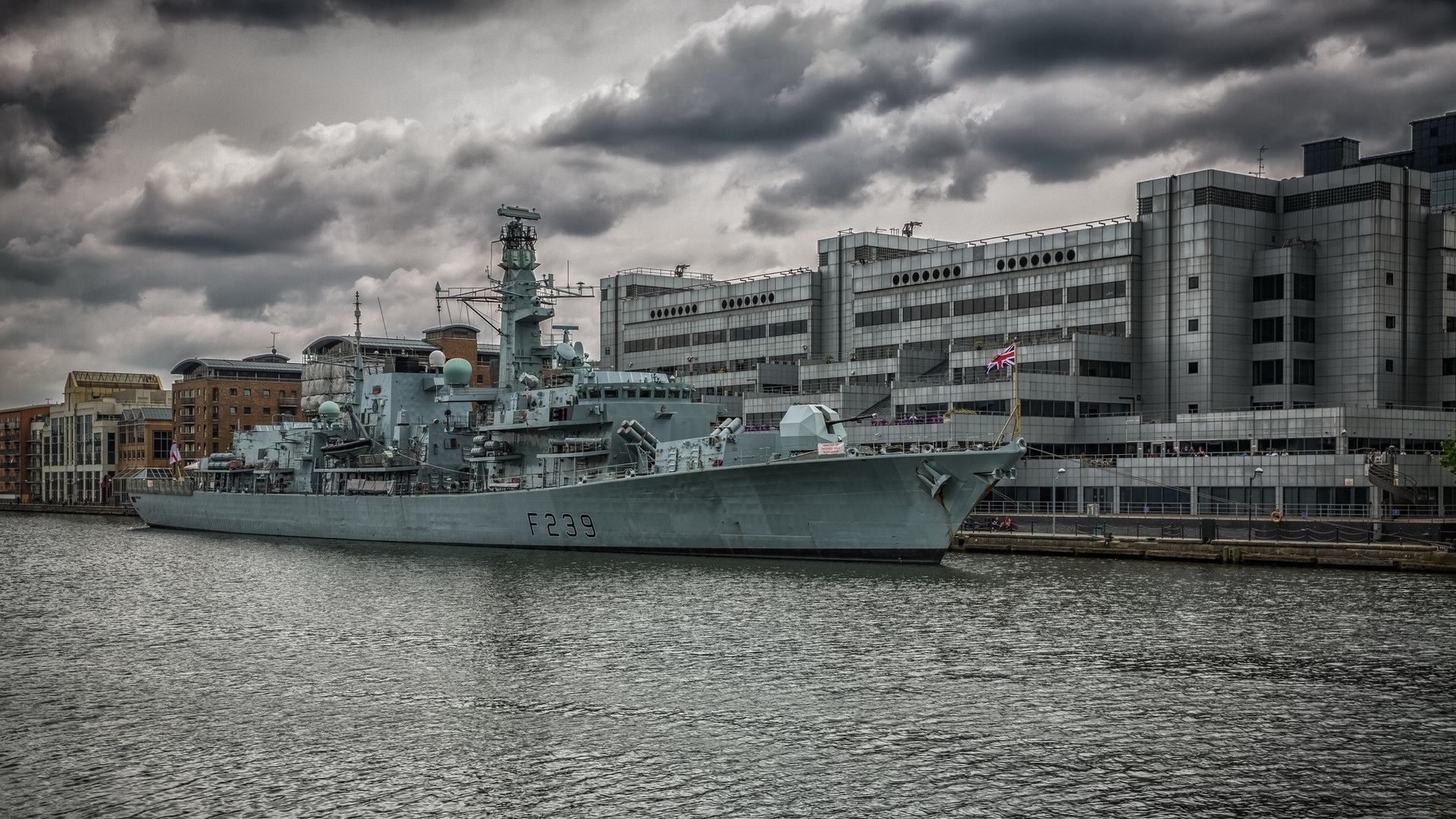 Description: A large ship is docked in a harbor near a building with a cloudy sky in the background and a building with a clock tower.