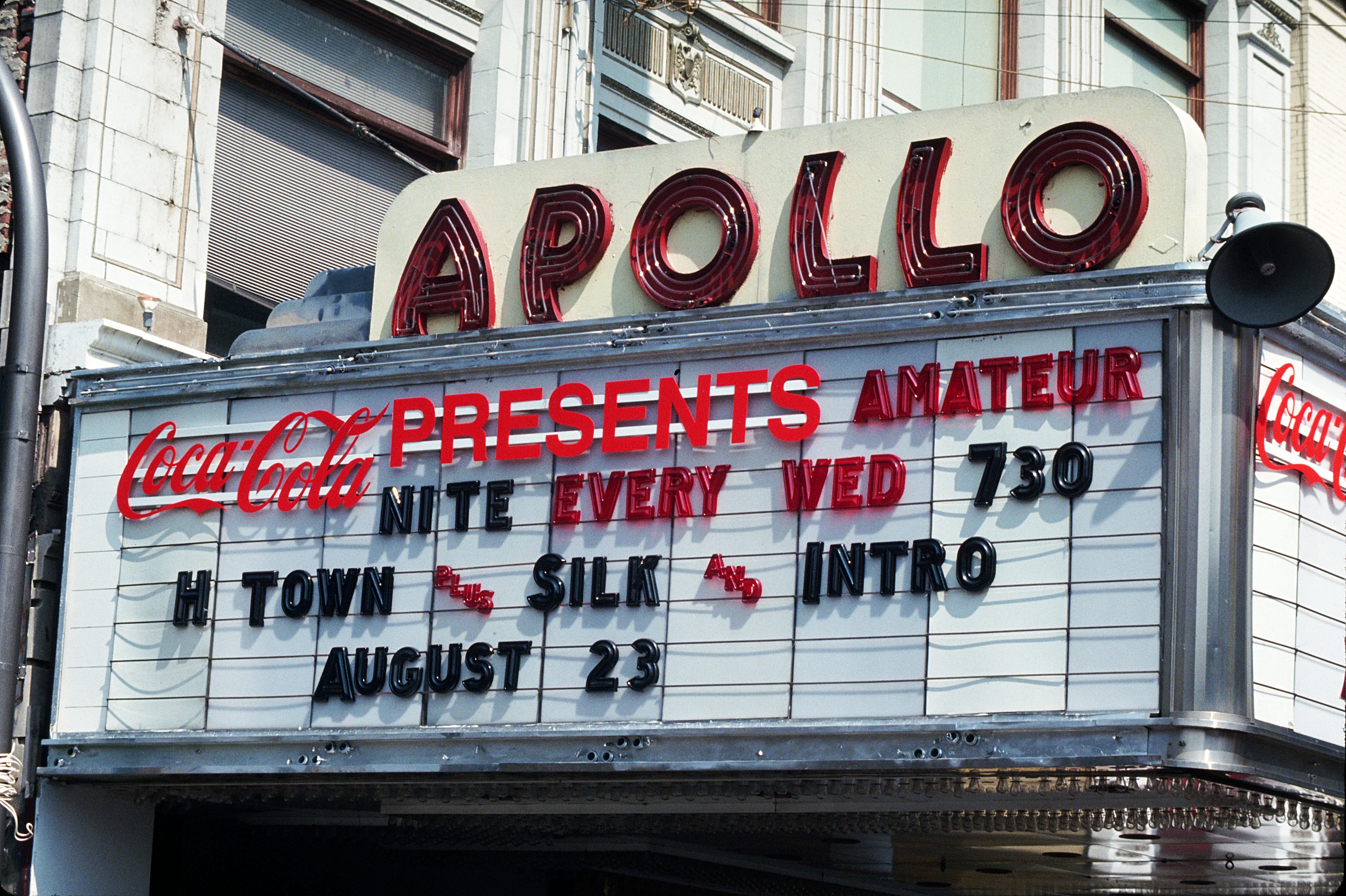 Description: A large marquee sign advertising a show called apololo on a city street corner in new york city.