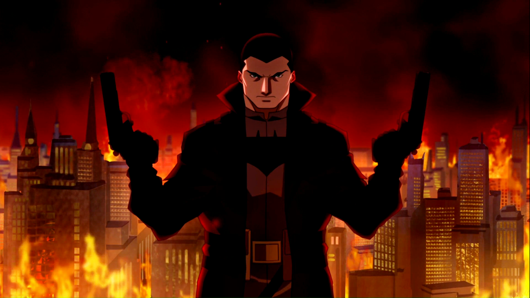 Description: A man holding two guns in front of a city skyline at night with red lights and smoke pouring out of the buildings.