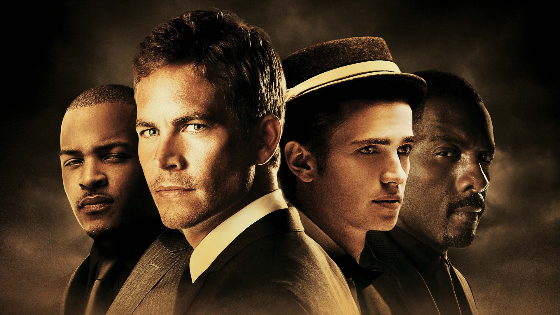 Description: A group of men standing next to each other in front of a dark background with smoke and fog in the air.
