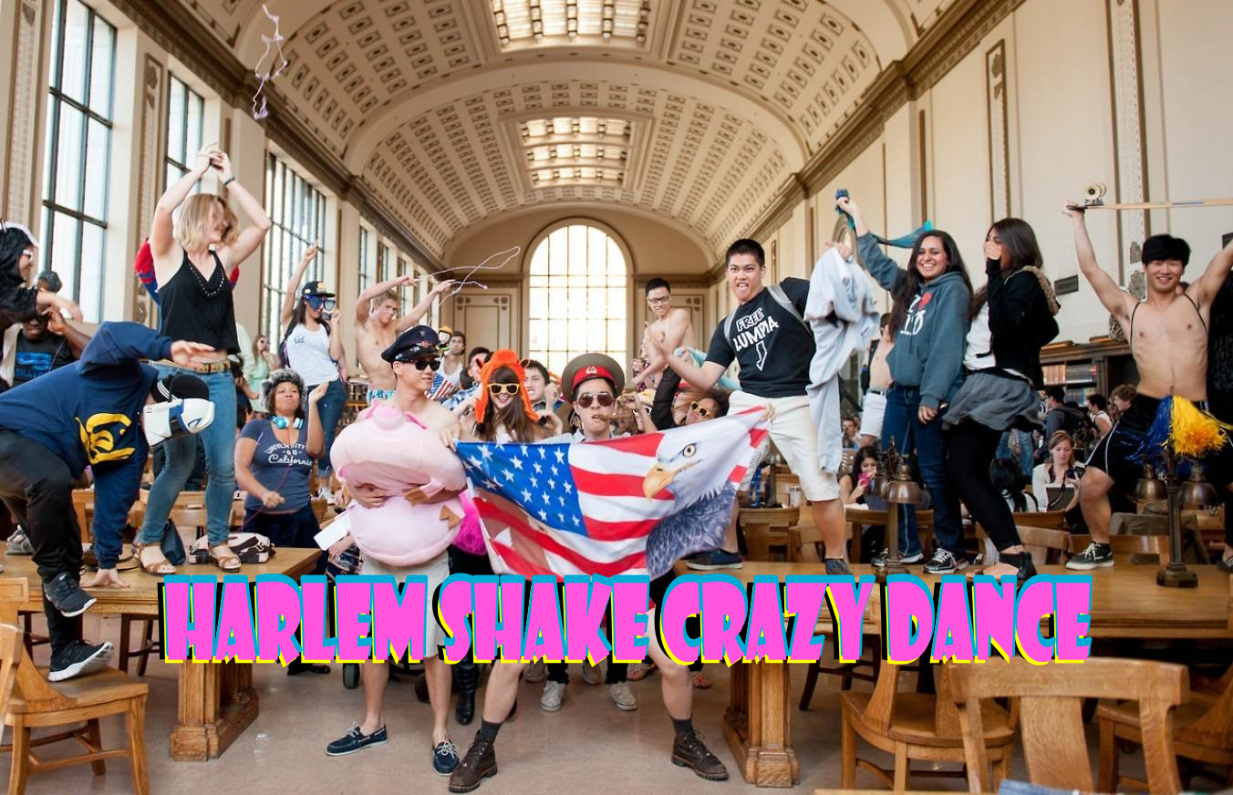 Description: A group of people standing around a room with a flag on the floor and a sign that says harlem shake grey dance.