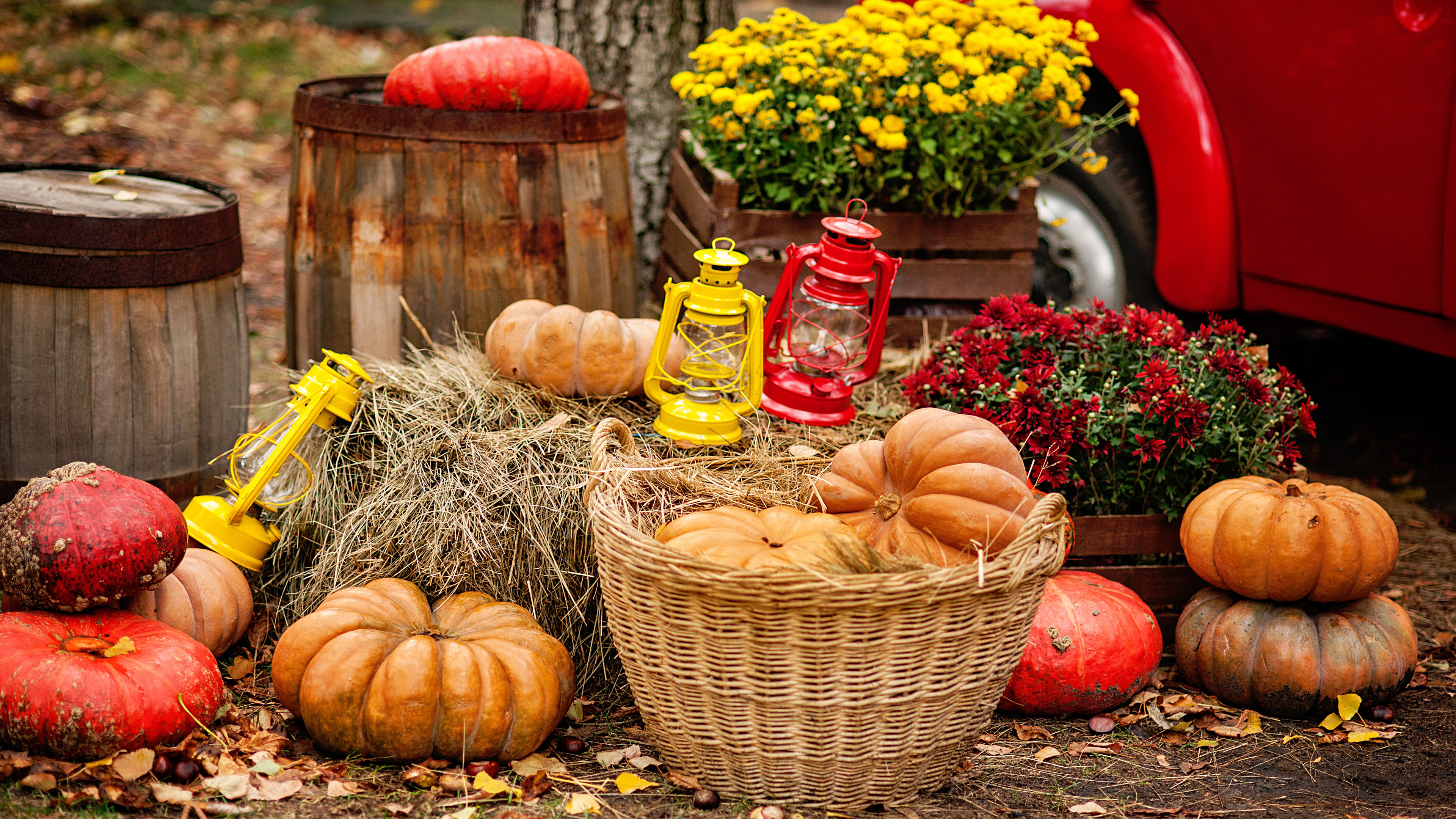 Description: A basket of pumpkins and gourds in front of a red truck and a red car with yellow flowers.