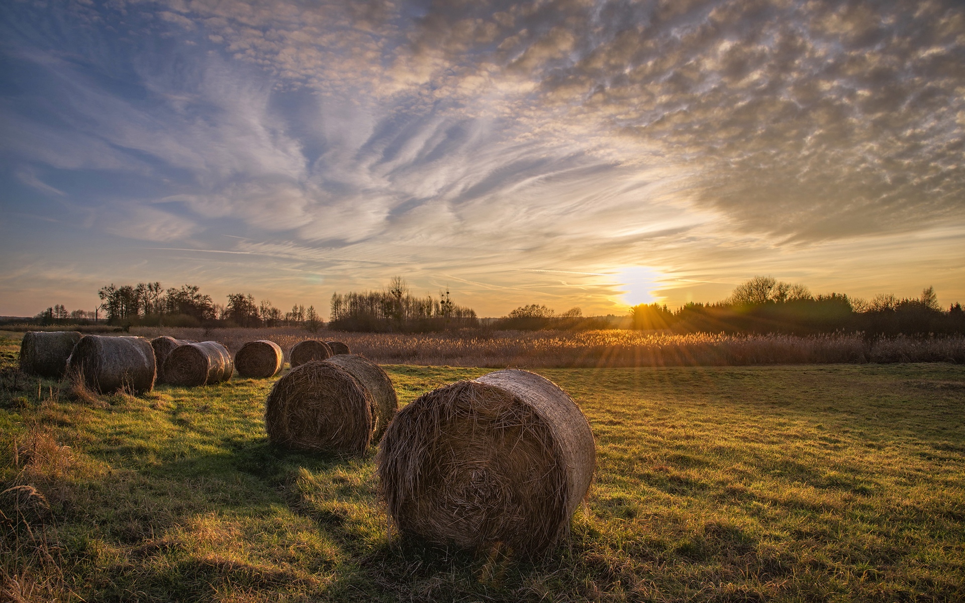 Description: A field with hay bales in the foreground and a sunset in the background with clouds in the sky.