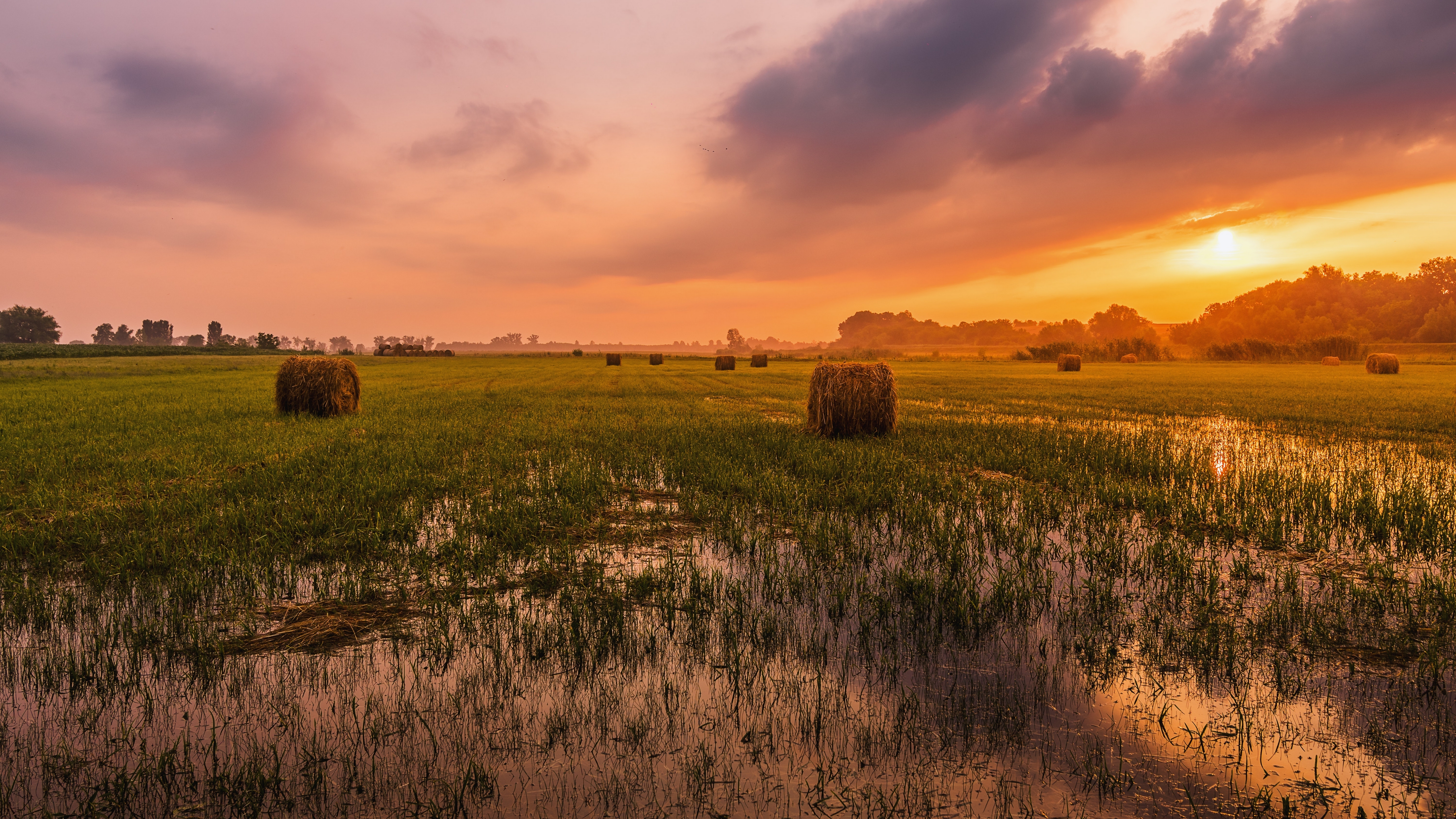 Description: A field with hay bales in the foreground and a sunset in the background with clouds in the sky.