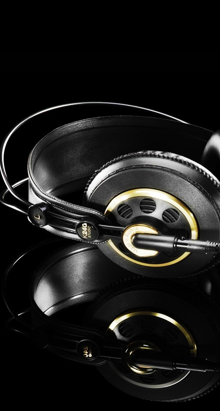 Description: A pair of headphones with a black background and gold accents on the ear and a black cord with a white and gold logo.