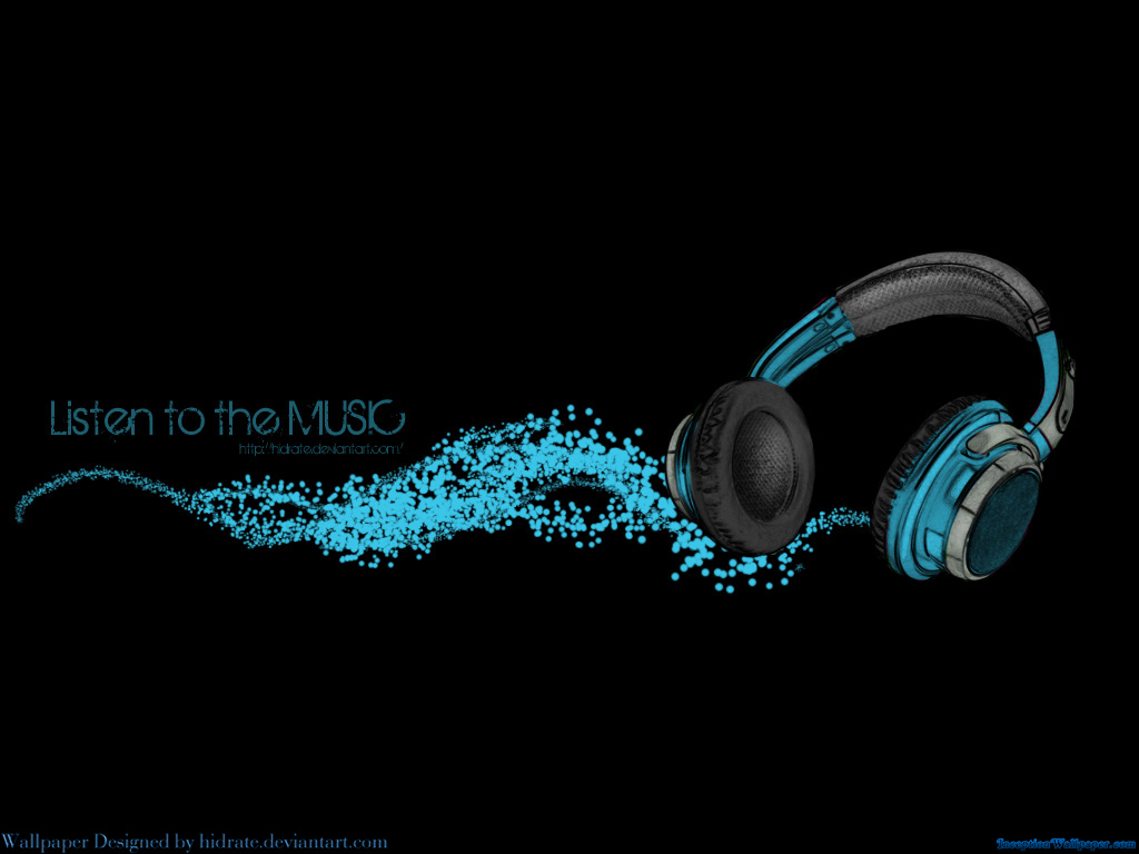 Description: A pair of headphones with blue dust coming out of them on a black background with the words listen to the music.