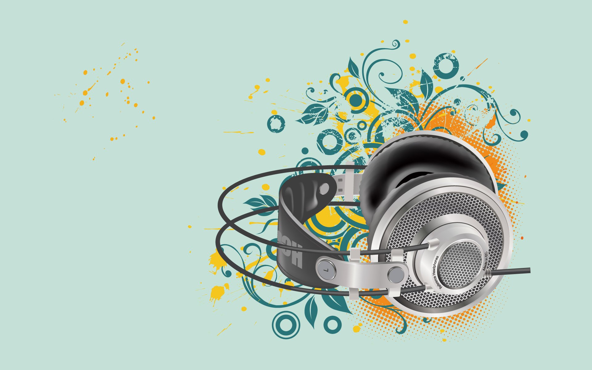 Description: A pair of headphones with a floral design on a blue background with a splash of paint on the side.