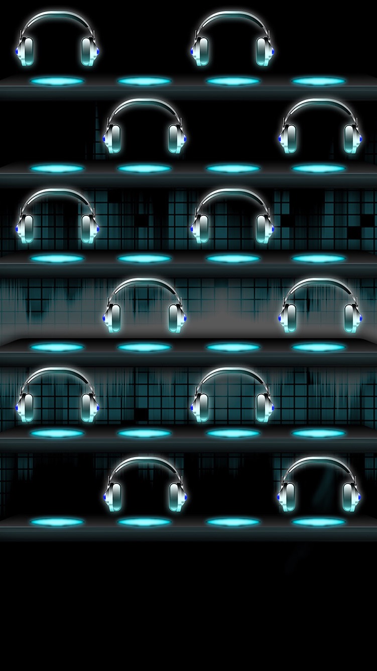 Description: A set of headphones are glowing in the dark room with a black background and a blue light at the end of the row.