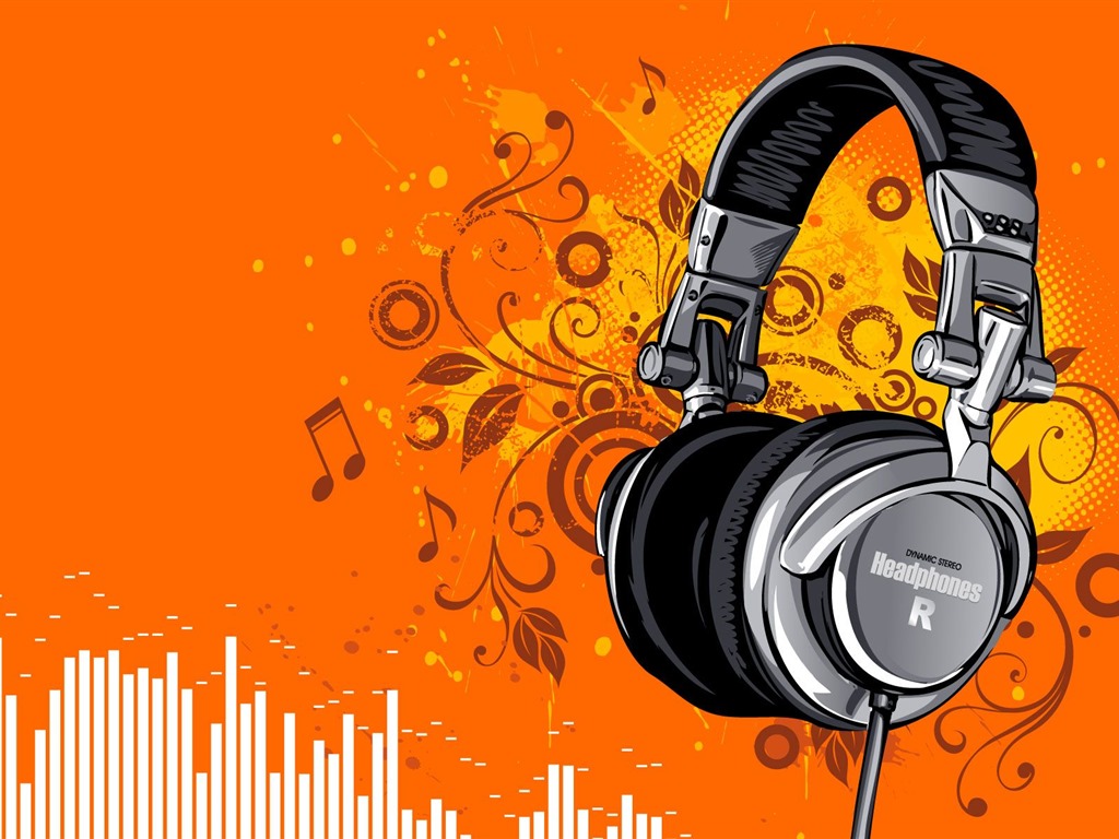 Description: A pair of headphones with a music note in the background with a splash of paint on the wall.