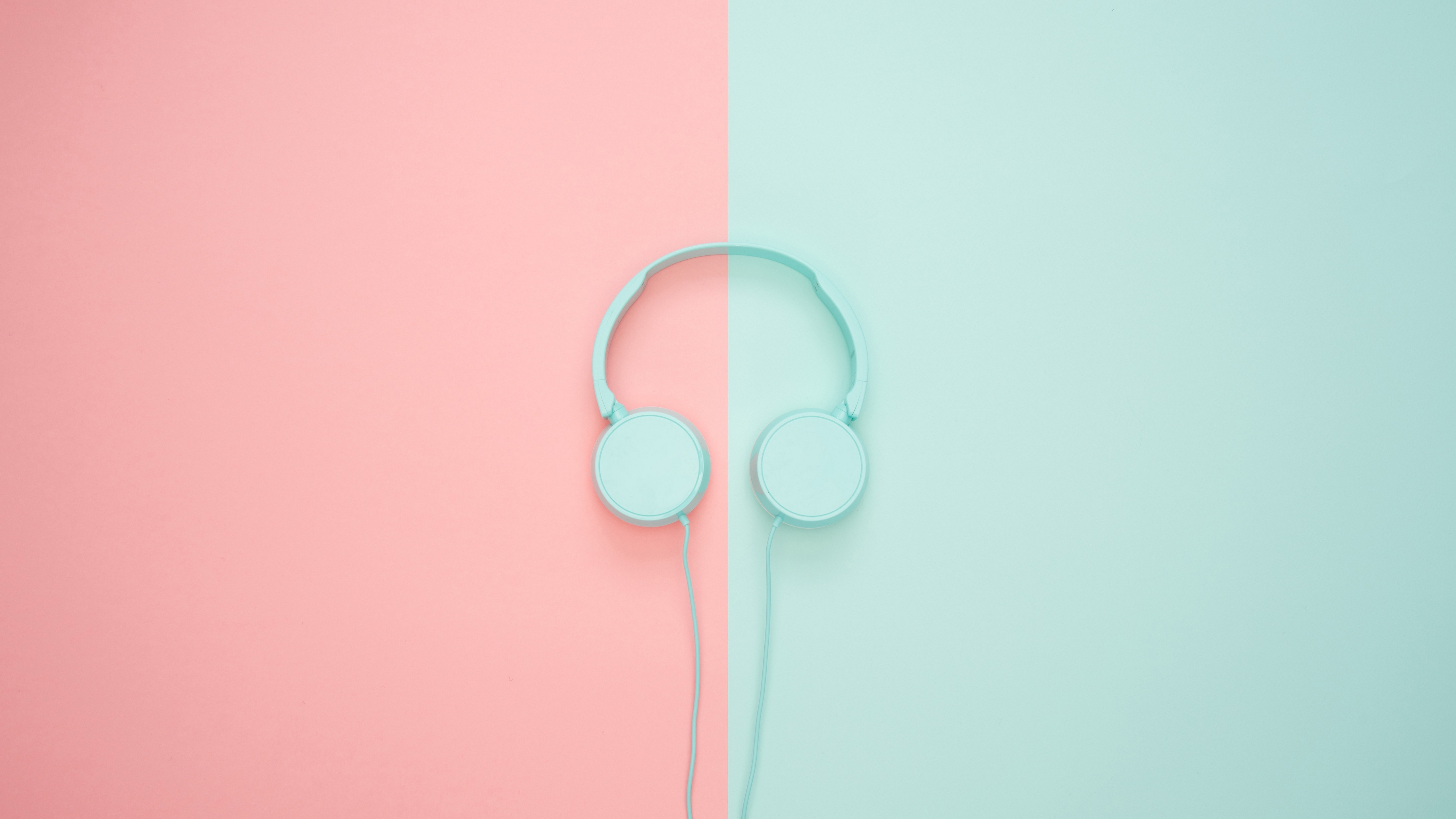 Description: A pair of headphones on a pastel background with a pink and blue background and a blue and pink wall.