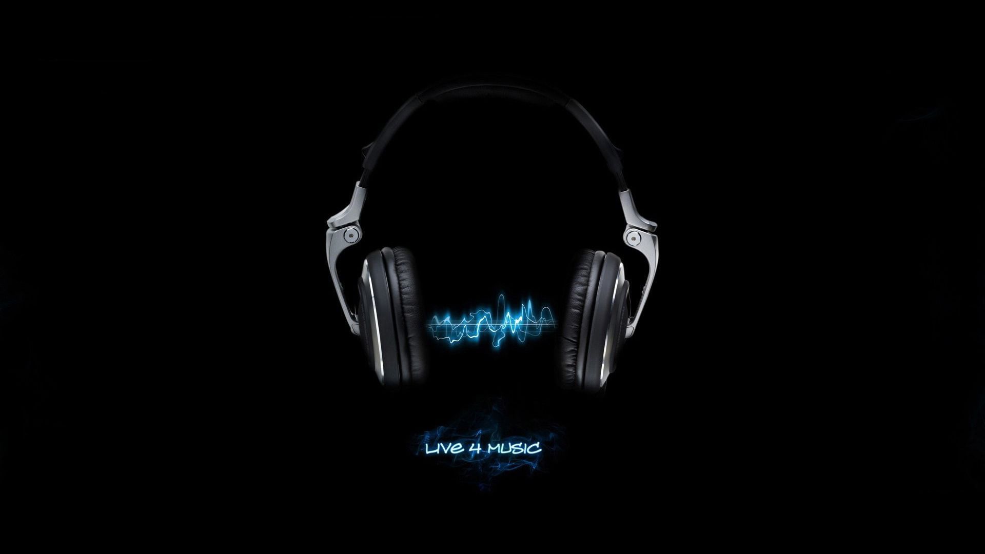 Description: A pair of headphones with a sound wave on the side of it in the dark with a black background.