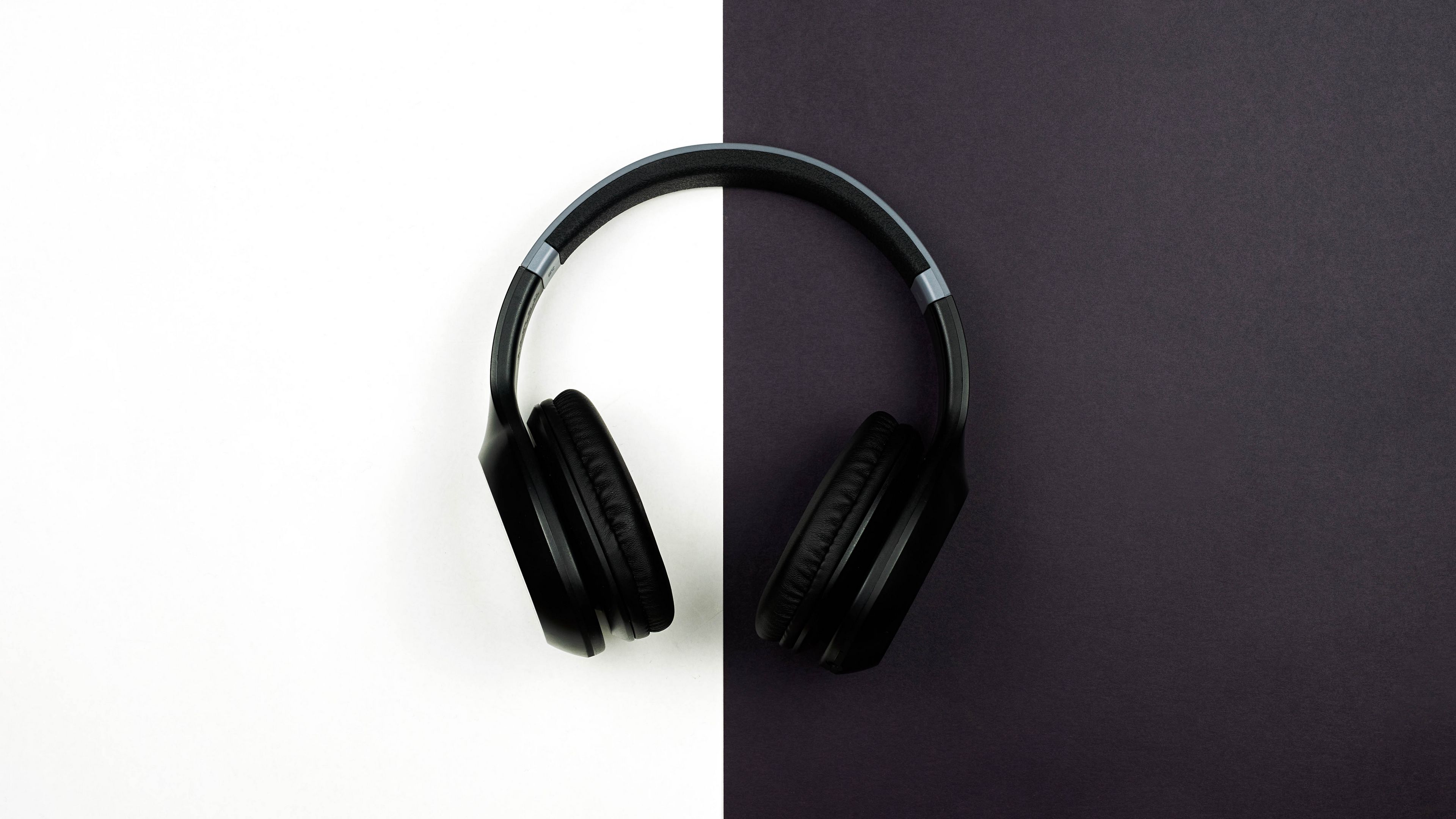 Description: A pair of headphones sitting on top of a table next to a wall with a white and black stripe.