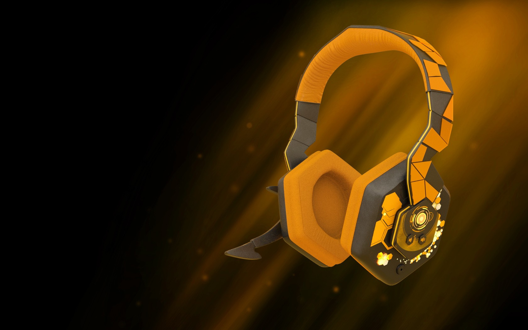 Description: A pair of headphones with a yellow and black design on it's side and a black background.