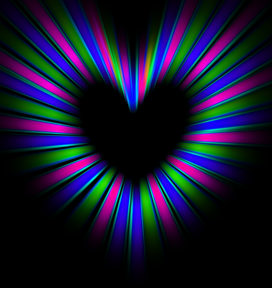 Description: A heart shaped object with a black background and a rainbow colored light in the middle of it.